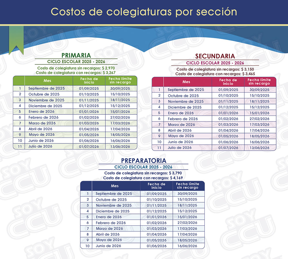 Los pagos de colegiatura serán del 1 al 15 de cada mes, posterior a esa fecha habrá un recargo del 10%, mismo que deberá cubrirse en su totalidad para que sea tomada en cuenta la mensualidad correspondiente.
